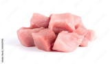 Pile of pork uncookes chopped cubes close up isolated on white background