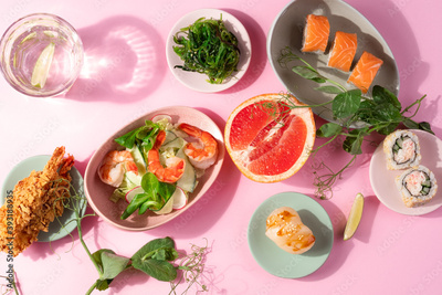 Sushi set flat lay on pink background. Creative layout of asian food. Maki roll with salmon, California roll, scallop sashimi nigiri, wakame, fried shrimps, prawn salad, fruits. Bright close up