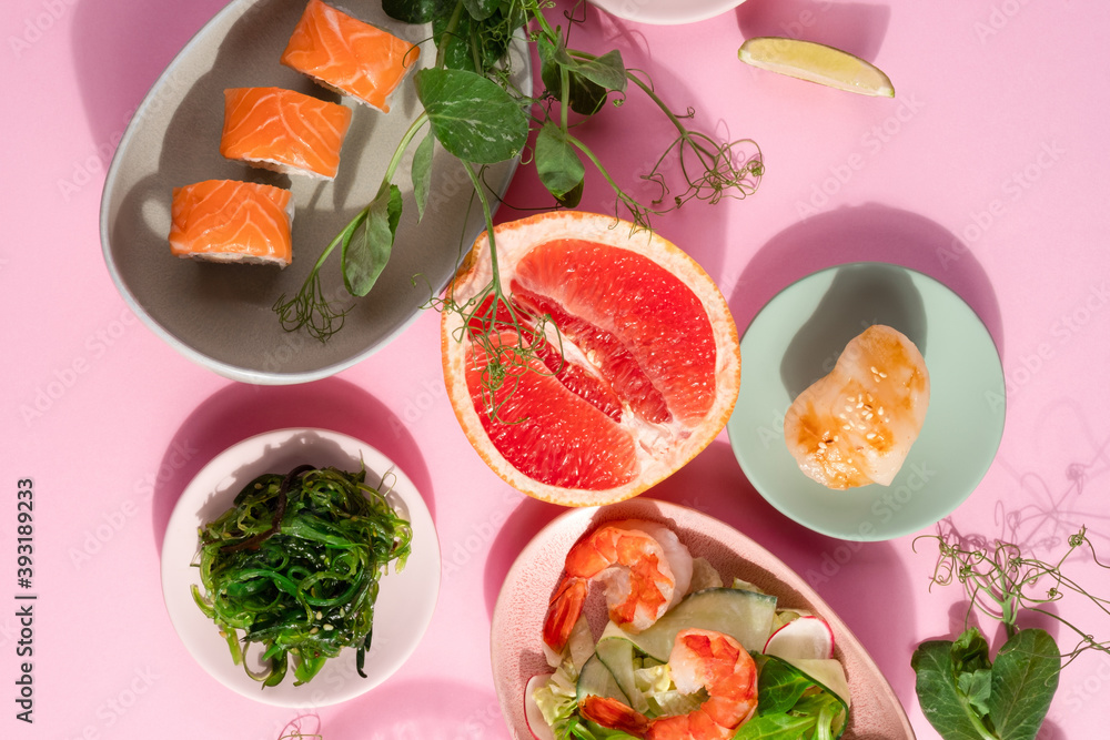 Sushi set flat lay on pink background. Creative layout of asian food. Maki roll with salmon, California roll, scallop sashimi nigiri, wakame, fried shrimps, prawn salad, fruits. Bright close up