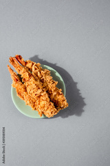 Deep fried tempura prawns on grey background. Traditional japanese fast food creative layout. Sushi restaurant menu. Spicy and crispy cooked shrimps. Vertical, close up with copy space
