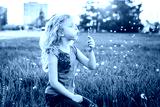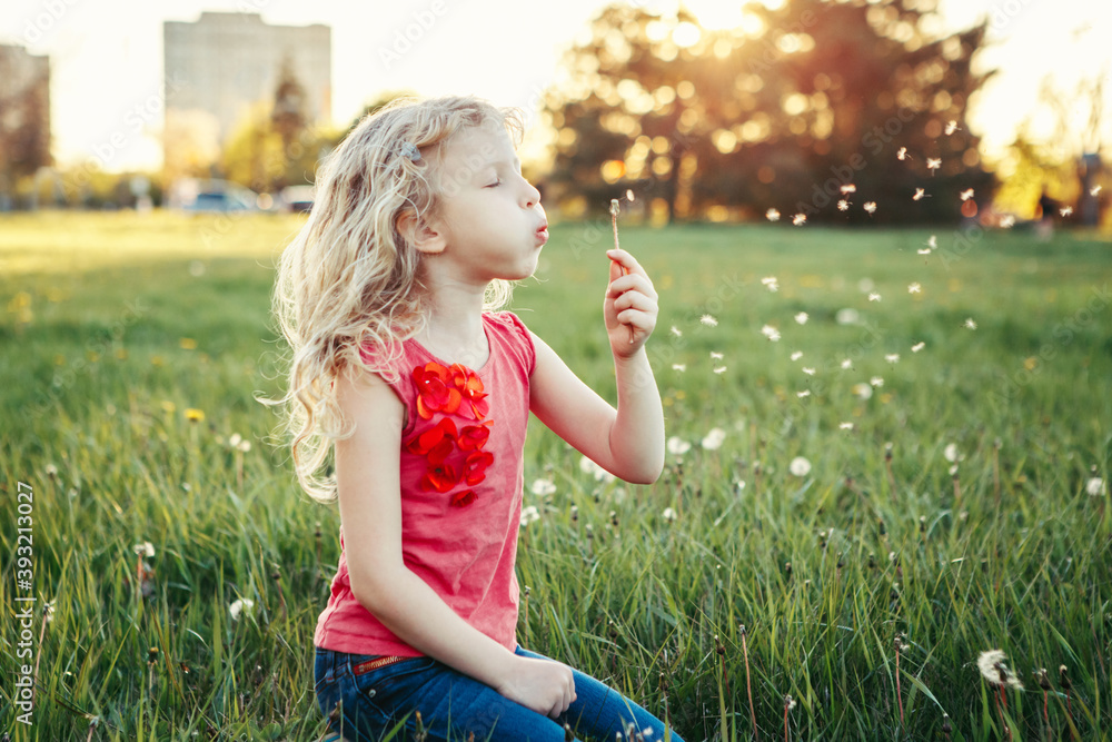 Cute adorable Caucasian girl blowing dandelions. Kid sitting in grass on meadow. Outdoors fun summer seasonal children activity. Child having fun outside. Happy childhood lifestyle.