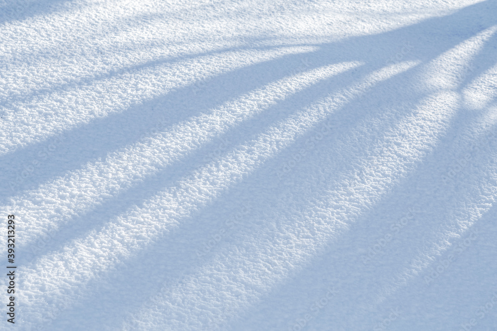 Abstract white snow winter texture. Christmas holiday background. Seasonal fresh white color snow nature backdrop wallpaper with tree shadows on ground. First frost. Crisp textured ice outdoors.