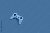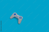 Old retro game joypad controller isolated on pastel blue background. Flat lay design