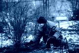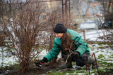 Caucasian cute woman gardener with garden tool close up, gardener pruning branches with pruning shears, winter plant pruning, winter gardening work in winter work clothes