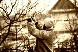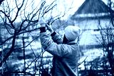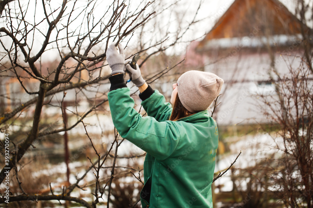Caucasian cute woman gardener with garden tool close up, gardener pruning branches with pruning shears, winter plant pruning, winter gardening work in winter work clothes