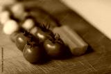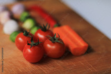Small vegetables on a wooden board - tomatoes, carrots, macro peppers close