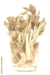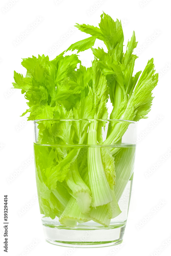Green fresh celery stalks in transparent glass with water isolated white background