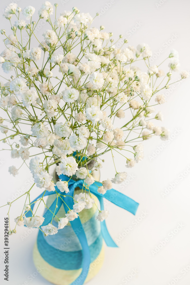 Bouquet gypsophila white tiny flowers with colorful striped blue vase and ribbon