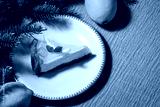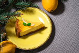 Lemon cheesecake slice on yellow plate on grey background. Beautiful, delicious cake with fir branches and lemons. Festive mood. Christmas party or Thanksgiving food. Dessert close up, copy space