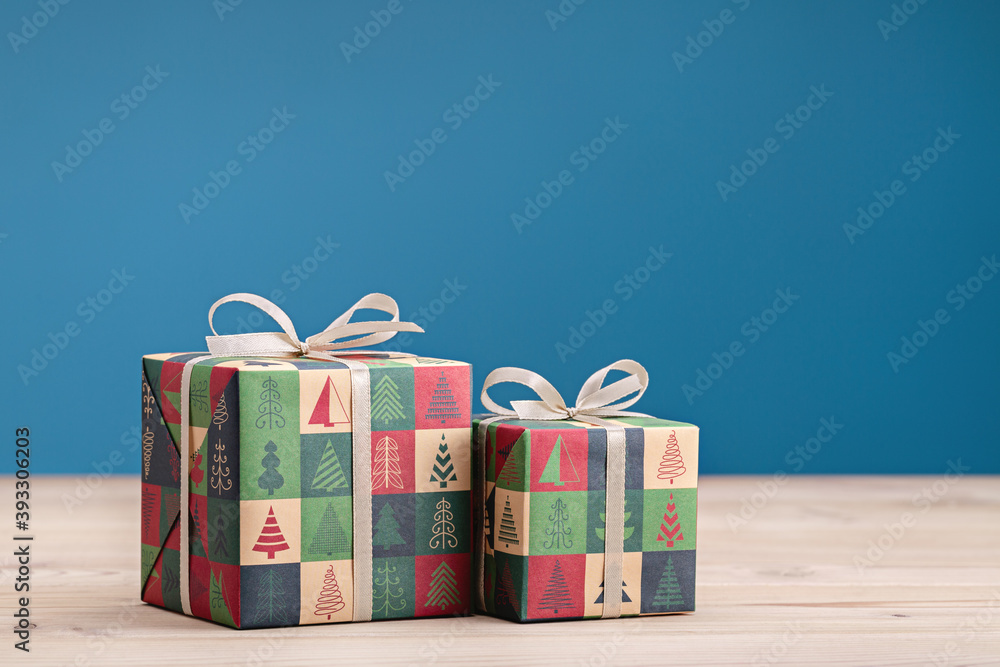 Gifts in boxes, wrapped in paper with Christmas and New Years drawings on light table. Copy space, blue background