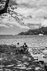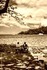 Retired couple enjoying a picnic in front of the Anse des Cascades bay on Reunion Island