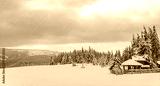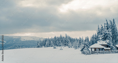 Beautiful snowy fir trees in frozen mountains landscape with house on north. Christmas background with tall spruce trees covered with snow. Alpine ski resort. Winter greeting card. Happy New Year
