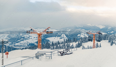 Ski elevator or funicular in snowy forest landscape winter. Panoramic view of frozen mountains background with fir trees covered by snow. Winter holiday and recreation on ski resort
