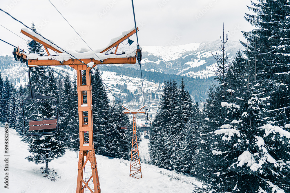 Ski elevator or funicular in snowy forest landscape winter. Panoramic view of frozen mountains background with fir trees covered by snow. Winter holiday and recreation on ski resort
