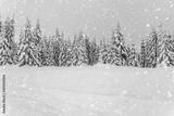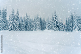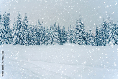 Beautiful snowy fir trees in frozen mountains landscape. Christmas background with tall spruce trees covered with snowflakes, bokeh, light. Winter greeting card. Happy New Year, snowfall
