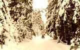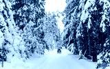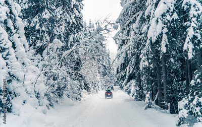 Rider driving in the quad bike race in winter in beautiful snowy road with fir trees in frozen mountains forest. Winter holiday