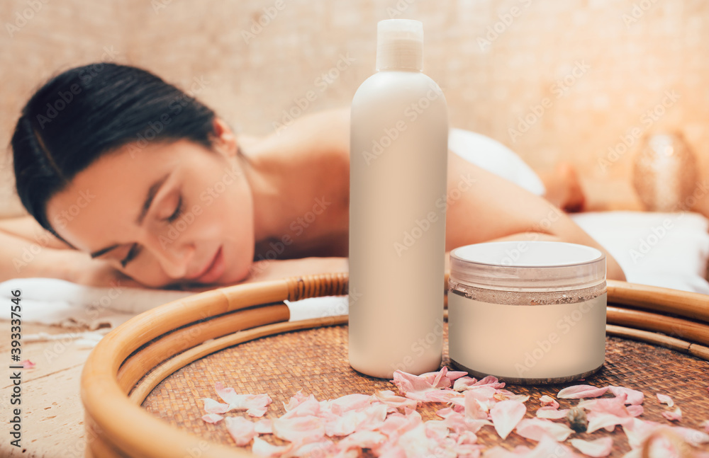 Body care products, mask and body peels, close-up. In the background, a woman after pampering skin and body.