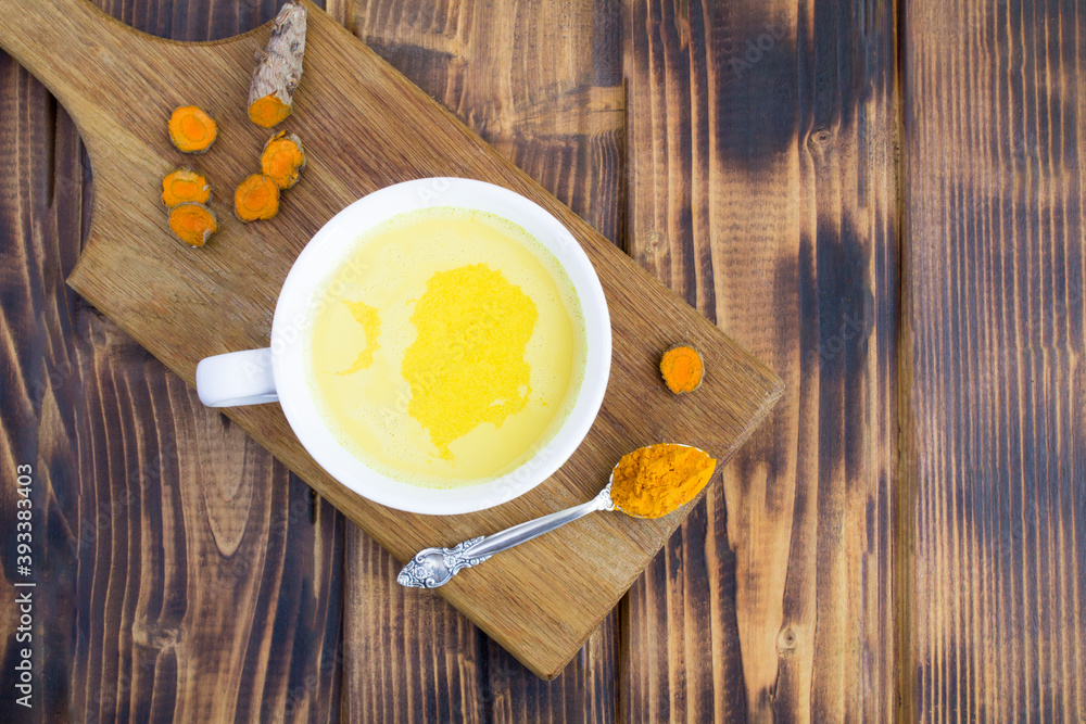 Top view of gold milk with turmeric in the white cup on the wooden background