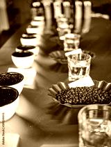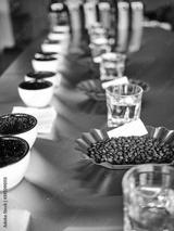 The best flavors. Close up shot of process of coffee cupping. Coffee is poured into tasting cups. Assortment of freshly roasted and ground coffee beans in containers. Selective focus. Vertical shot