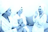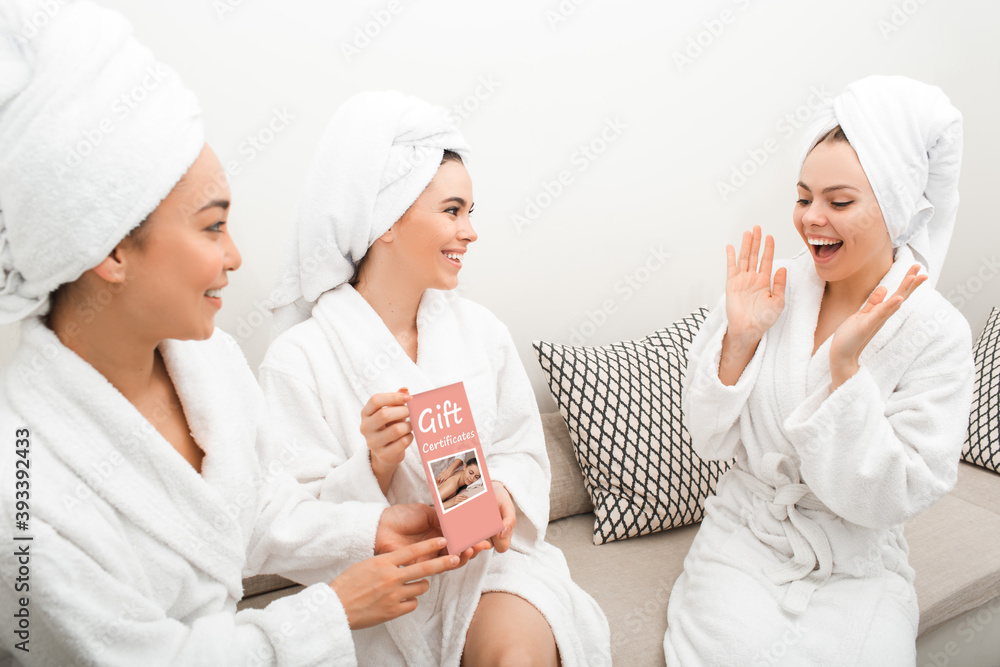 Two girlfriends present their woman friend a gift card at a wellness salon for spa treatment and massage
