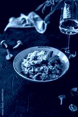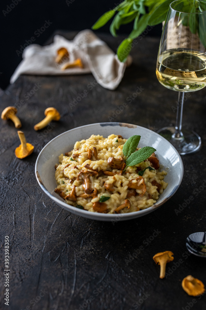 Risotto with chanterelles and saga leaves. Risotto and white wine
