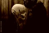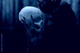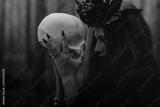 portrait of a terrible witch with a skull in the hands of a dead man performs an occult mystical ritual
