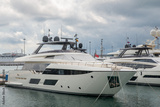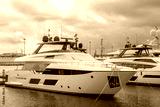 Speed boats at harbor. Power boats moored in marina. Sea coast pier.