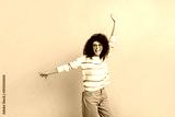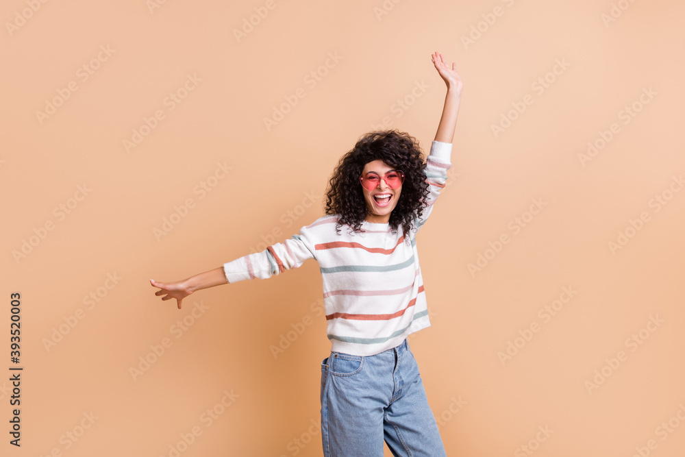 Photo of young excited young hispanic girl happy positive smile have fun enjoy crazy hand up isolated over beige color background