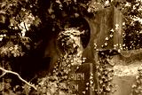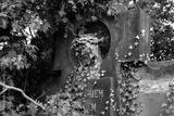 Stary grób obrośnięty bluszczem z wizerunkiem Chrystusa.