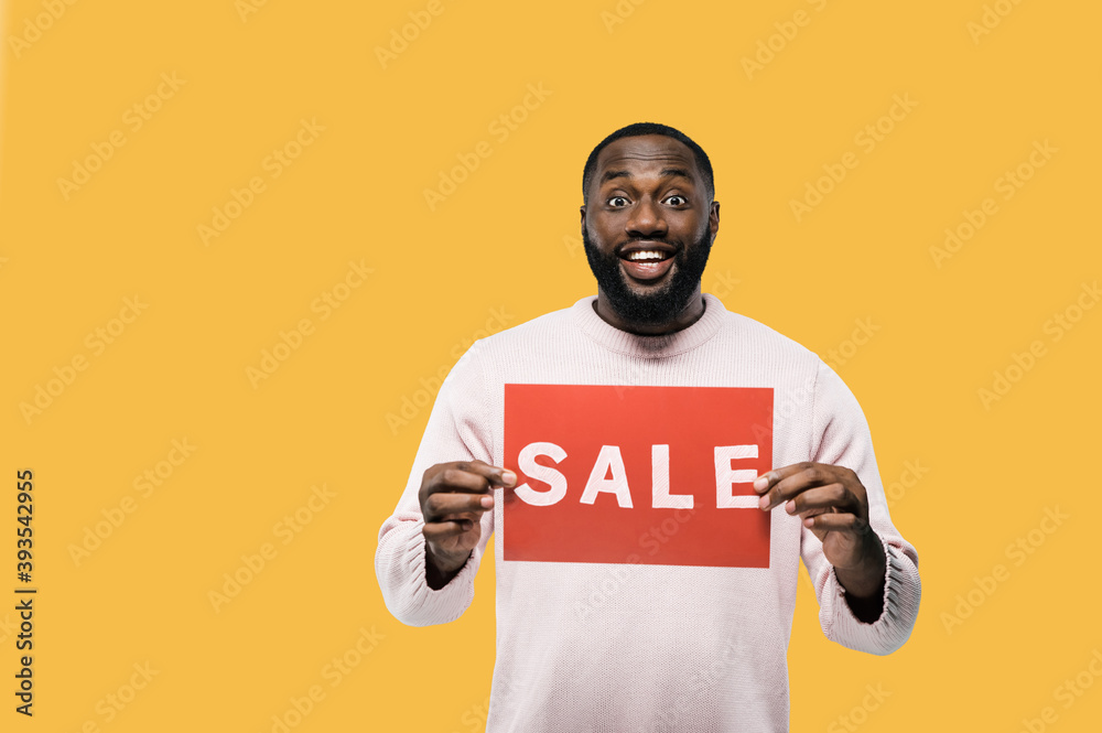 Handsome happy african american man is holds a red "sale" sign in his hand while looking at the camera and smiling, standing on a orange isolated background