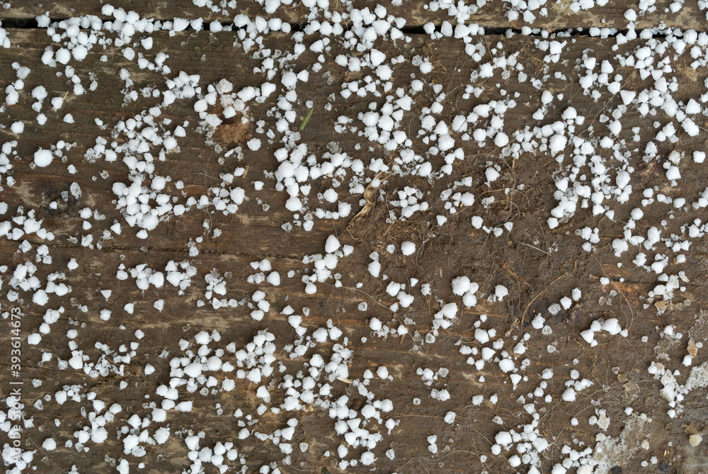 First snow flakes on dirty wooden floor close-up view