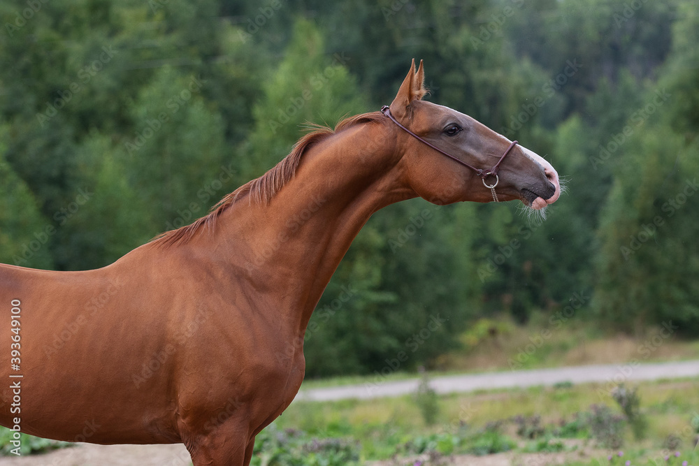 Portrait of a beautiful chestnut horse with mane stands on natural summer background, head closeup