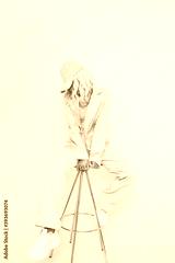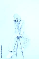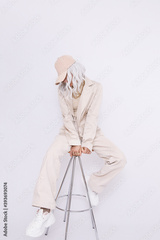 Urban Girl in studio. Trendy beige casual look. Denim Suit Jacket and Pants. Style in details. Fall winter season. White aesthetic