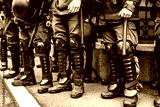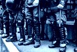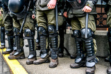 Legs of a policemen in protective ammunition and a green uniform. Knee pads, helmets, batons, boots.