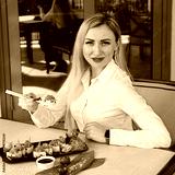 beautiful european girl having sushi roll, holding sushi with chopsticks