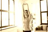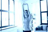 sport, fitness and healthy lifestyle concept - smiling young woman stretching arms at home