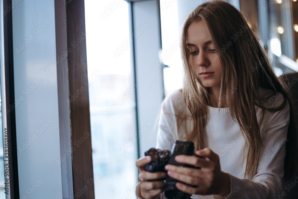 Female model with long blond hair sitting in workspace with camera in hands and looking into photocamera monitor