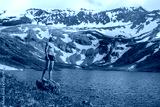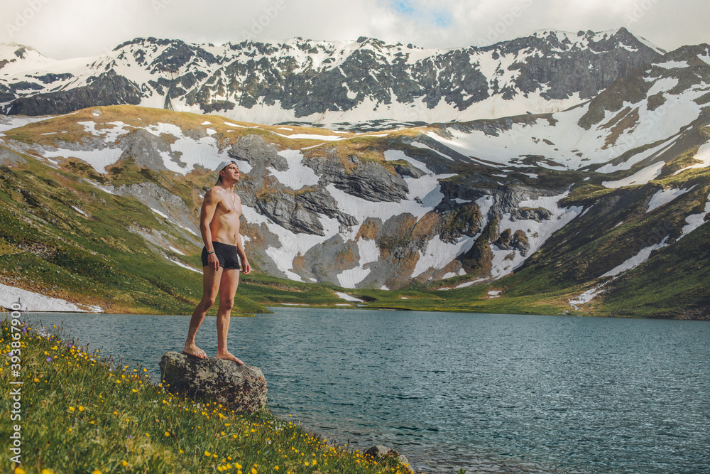 Tourist in a bathing suit standing up on the shore of a pure mountain lake