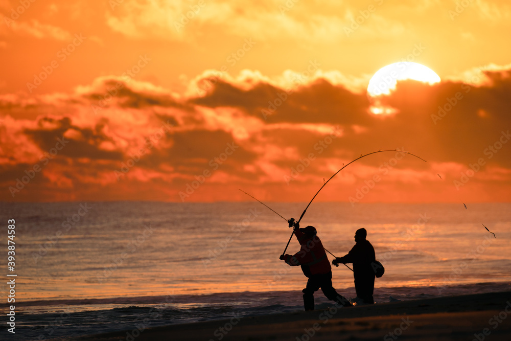 Silhouettes of surf casters fishing on the beach during a vibrant sunset.