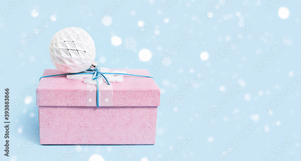 Red Christmas gift box with white bauble on blue. Merry Christmas or Happy New Year greeting card with copy space with snow bokeh lights