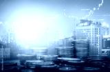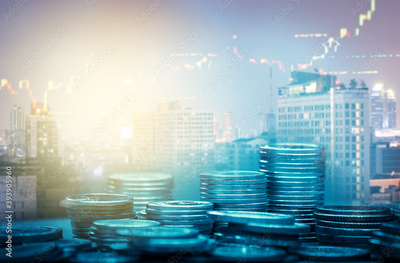 Double exposure of money coin, stock market or forex trading graph and candlestick chart suitable for financial investment concept.