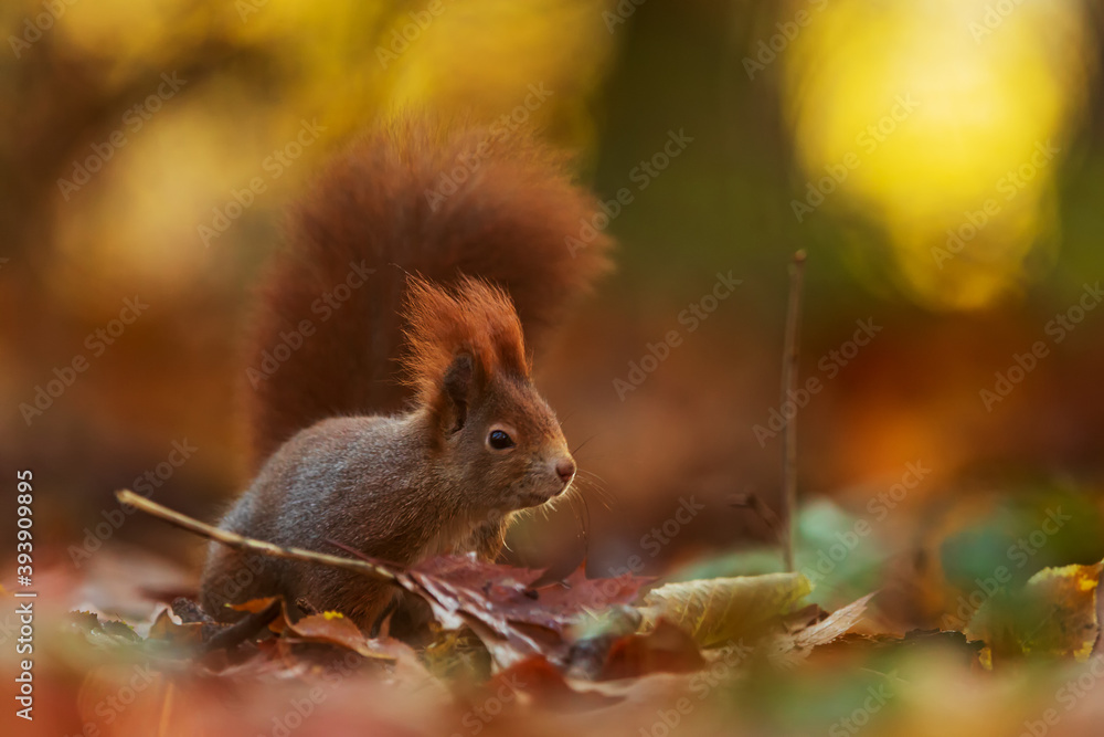 small animal Eurasian red squirrel (Sciurus vulgaris) on the ground in colorful leaves found food
