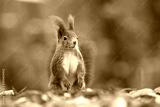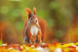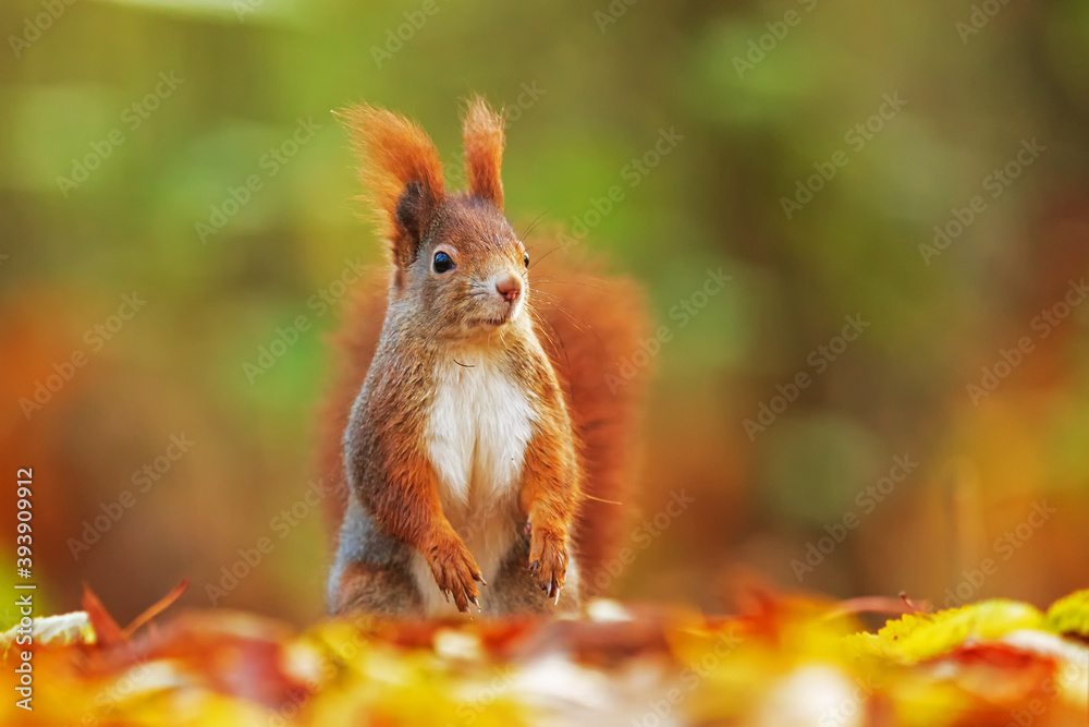 small animal Eurasian red squirrel (Sciurus vulgaris) stands intently and looks around with a very colorful background
