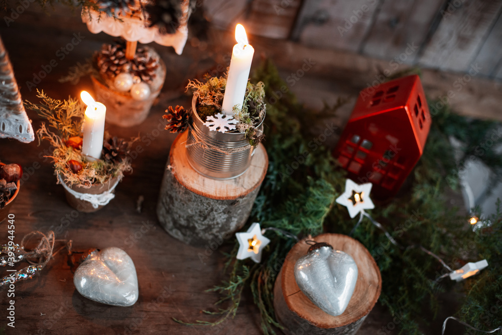 Natural christmas window decoration with handmade reindeer and trees of wood.