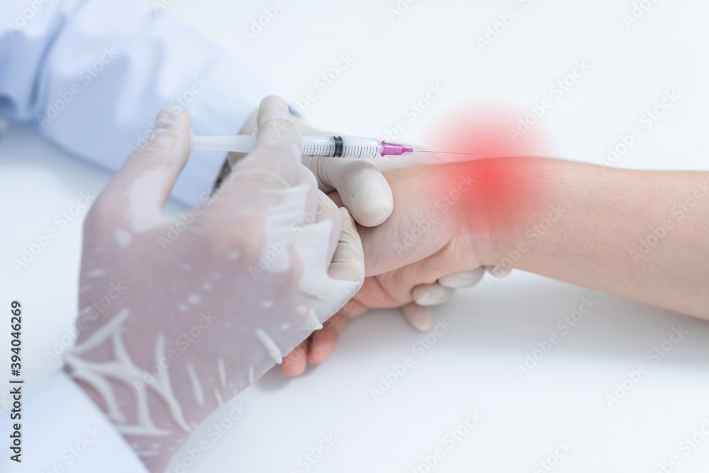 close up doctor or nurse hands with syringe injecting to wrist medical. Wrist bone problems painful wrist caused by prolonged work. Carpal tunnel syndrome, arthritis, neurological disease concept. .