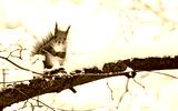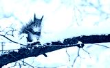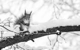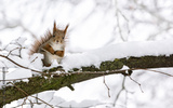 red squirrel sitting on tree branch in winter forest and looking in camera