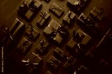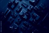 Elegant black Christmas theme. Wrapped gifts in black matte paper with ribbon