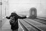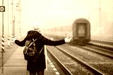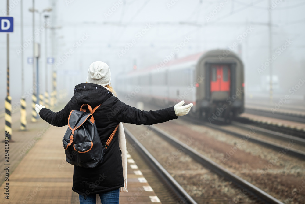 Woman traveler is at wrong railroad station platform and looking at leaving train