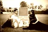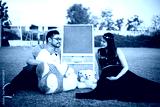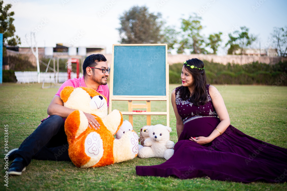 Young pregnant asian indian couple looking at each other sitting in a garden with lots teddy bear toys and blank chalkboard to write message. pregnancy concept.