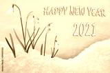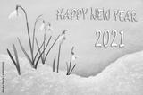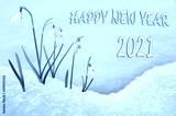New Year 2021 greeting card, group of snowdrops, Happy New Year text in English language